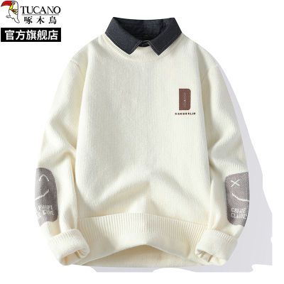 啄木鸟2024冬季新款衬衫领毛衣加绒加厚假两件针织衫男士大尺码卫生衣