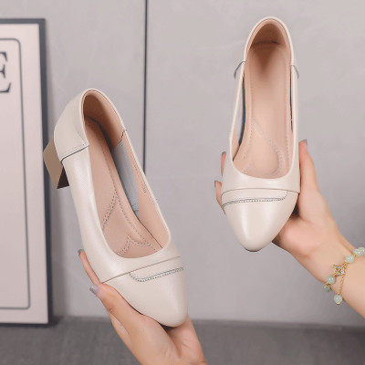 真皮单鞋女中跟春秋浅口女工作皮鞋软底舒适四季鞋粗跟妈妈鞋