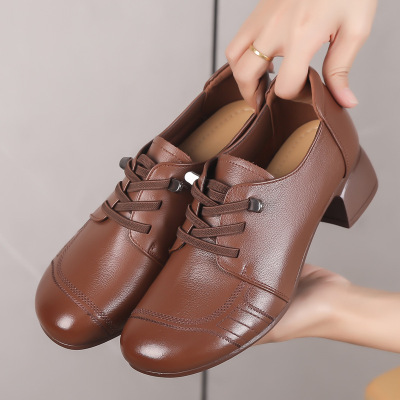 真皮中跟小皮鞋女春秋复古休闲百搭妈妈鞋粗跟舒适软底四季鞋