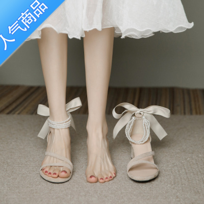 SUNTEK小众绑带高跟鞋女粗跟2023年新款夏季法式珍珠凉鞋女中跟伴娘鞋32