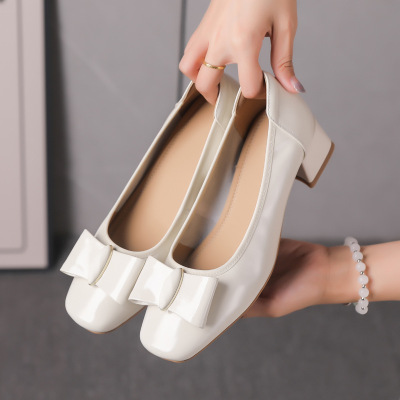 中跟鞋女新款简约气质一脚蹬工作鞋粗跟复古通勤漆皮女四季鞋