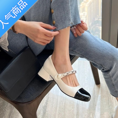 聚范复古玛丽珍鞋女2024新款法式方头漆皮一字扣带粗跟单鞋白色高跟鞋