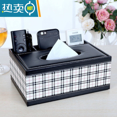 敬平多功能纸巾盒抽纸盒茶几客厅遥控器收纳盒酒店家用餐巾纸抽盒简约 皮革白格子拼接后三格