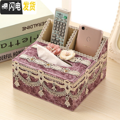 三维工匠欧式多功能纸巾盒客厅抽纸盒遥控器收纳盒布艺蕾丝桌面纸抽盒家用 流光-紫色
