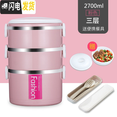 三维工匠多层饭盒套装上班族大容量不锈钢微波炉便当盒学生带饭餐盒保温桶 粉色[三层+餐具]