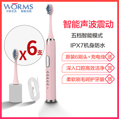worms电动牙刷男女成人家用充电式软毛全自动牙刷防水声波牙刷 蜜桃粉 五档位充电款配(原装6刷头+USB充电线)