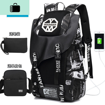 背包男双肩包大容量轻便男士旅行包潮流书包户外登山休闲旅游背包NEW LAK 大号黑白NYC[USB充电版]+单肩包+笔袋