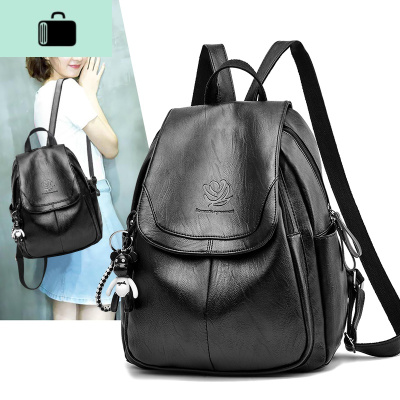 双肩包女2020新款大容量时尚韩版百搭软皮旅行学生书包女士小背包NEW LAKE 黑色[可放A4杂志书本等]