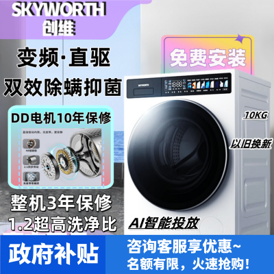 创维10公斤超净筒超薄滚筒洗衣机全自动1.2洗净比精华洗智能投放大桶径DD直驱变频XQG100-B92KDT_珍珠白
