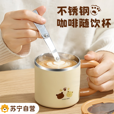 苏宁不锈钢早餐杯带盖勺牛奶杯酸奶杯便携米粥杯豆浆杯子7017