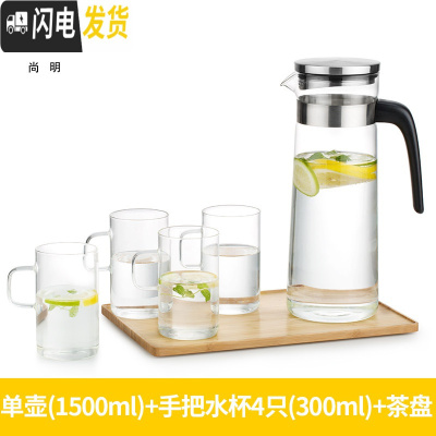 三维工匠可高温防爆玻璃大容量冷水壶 家用玻璃果汁凉水壶水杯套装 单壶+4个300手把水杯+托盘