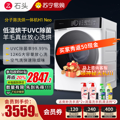 石头H1 Neo冰川分子筛洗烘一体机 家用12公斤大容量滚筒洗衣机洗烘一体洗衣机全自动智能投放空气洗 冰川白 洗烘一体机