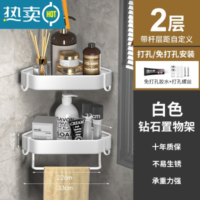 敬平免打孔卫生间沐浴露置物架浴室架子墙角厕所转角壁挂淋浴房三角架 白色♥加厚加大钻石款♥→双层 带杆浴室置物架