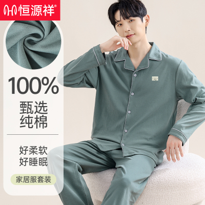 恒源祥宽松家居服男士春秋夏季纯棉睡衣纯色新款长袖翻领套装