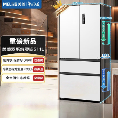 美菱无忧嵌511法式四门双开家用大容量超薄零嵌双系统全净一级节能低噪风冷无霜底部散热冰箱BCD-511WP9CZX雪域白
