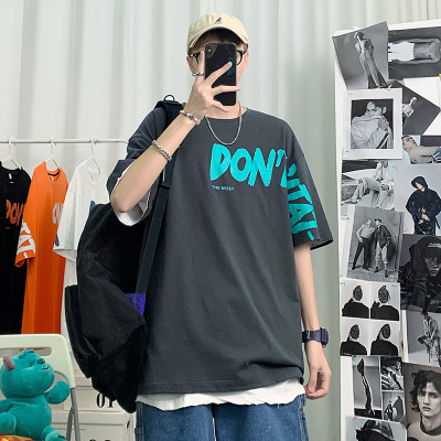 男装短袖T恤夏季新款日系印花学生假两件时尚纯棉打底衫男士
