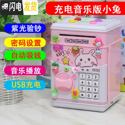 三维工匠创意可爱儿童防摔电动密码箱指纹卡通网红存钱储蓄罐男孩女孩公主 充电音乐小兔