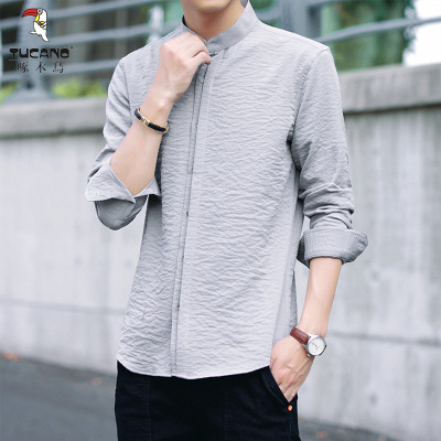 啄木鸟小立领抗皱易打理衬衫男士四季中山装青年圆领中式占领衬衣
