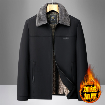 新款男士休闲毛领棉衣秋冬翻领外套中老年爸爸装加绒加厚棉服