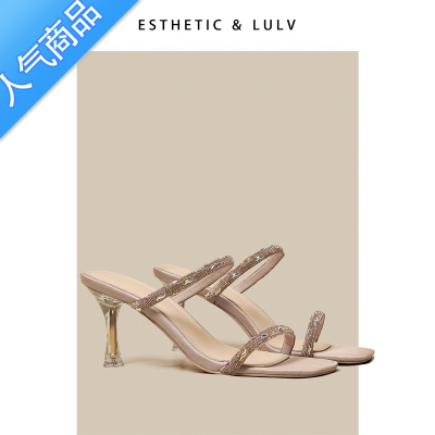 SUNTEK路侣 杏色法式高跟鞋女夏季拖鞋女外穿气质名媛水钻一字带凉鞋女