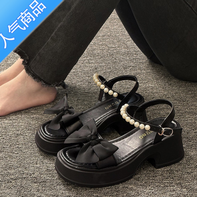 SUNTEK凉鞋女2023新款夏季蝴蝶结仙女风厚底珍珠一字带时尚露趾罗马女鞋