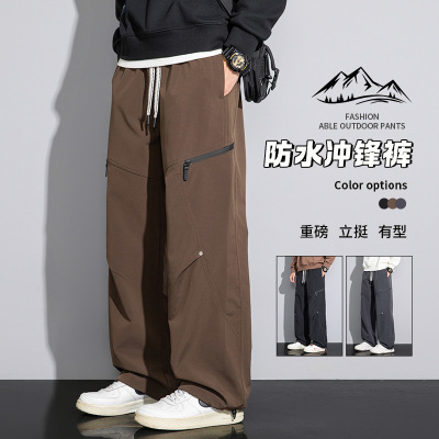 春秋季新款防水冲锋裤男士户外直筒宽松百搭休闲美式阔腿男生长裤