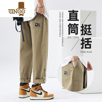 YANXU工装裤男潮牌宽松直筒卡其色休闲九分阔腿长裤子2023夏季