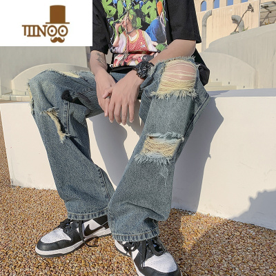 YANXU美式高街破洞牛仔裤男夏季港风潮流直筒长裤ins潮牌街头乞丐裤子