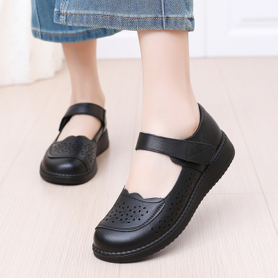 真皮圆头加宽女鞋夏款平跟软底妈妈鞋透气舒适镂空洞洞鞋