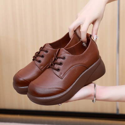 单鞋女春秋新款坡跟系带英伦圆头厚底女鞋真皮秋季百搭小皮鞋