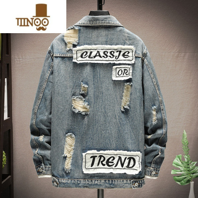 YANXU乞丐破洞牛仔外套男复古百搭宽松工装夹克秋季贴布潮流帅气上衣服
