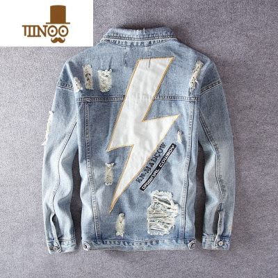 YANXU秋季学生复古贴布牛仔外套男士韩版做旧修身衣服潮牌乞丐破洞夹克