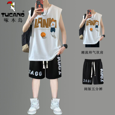 啄木鸟新款夏季纯棉背心坎肩男孩无袖T恤青少年学生潮流帅气套装