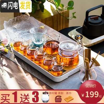 三维工匠耐热玻璃茶具套装家用简约现代功夫泡红茶壶煮茶器日式透明茶杯子 透明色亮彩壶10件套+平板排水茶盘(三连送)