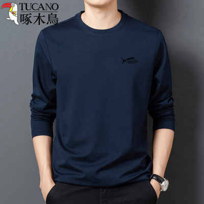 啄木鸟春秋季中年男士圆领纯棉长袖T恤宽松上衣服男装体恤打底衫