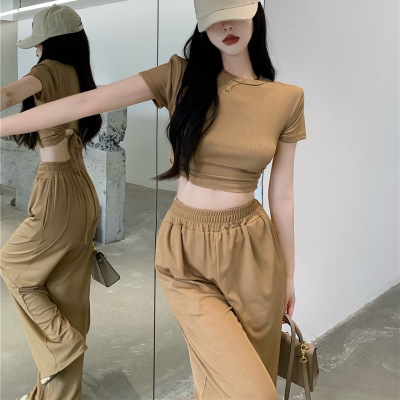 性感露背短袖T恤女微喇休闲长裤拖地裤两件套女短款打底衫套装女