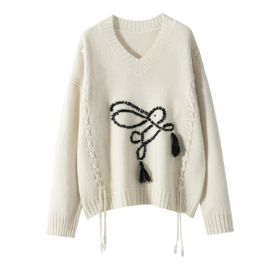 V领手工勾花小兔子复古山羊绒衫女针织打底衫宽松厚款长袖毛衣暖
