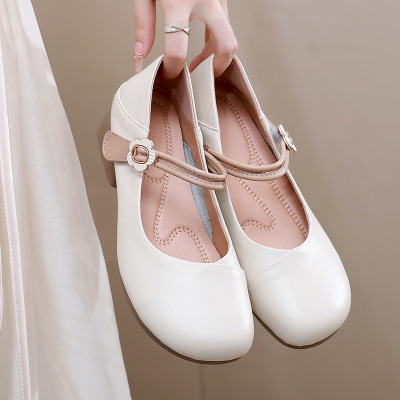 玛丽珍鞋女秋季复古牛皮圆头浅口四季单鞋中跟搭扣两穿乐福鞋