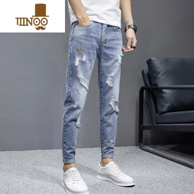 YANXU夏季九分牛仔裤男士韩版修身小脚裤潮牌款男款夏天破洞男裤子