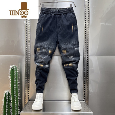 YANXU夏季新款油漆涂鸦休闲牛仔裤男士弹力束脚哈伦裤潮牌痞帅小脚长裤