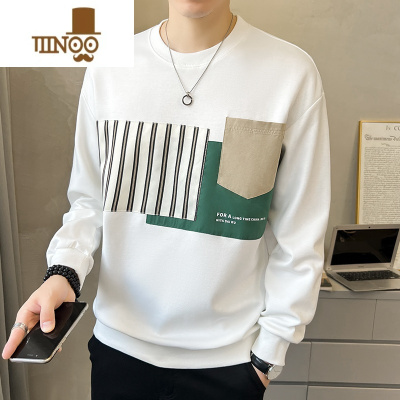 YANXU男士卫衣圆领拼接2023新款潮牌加绒加厚白色内搭上衣打底衫