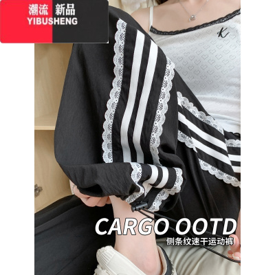 YIBUSHENG美式蕾丝边工装直筒休闲裤女季高腰慵懒风垂感速干阔腿运动裤子