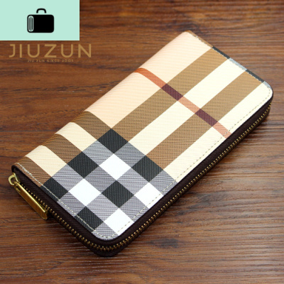欧美新款复古长款手包欧美拉链简约小零钱包钱夹皮夹男女士潮NEW LAKE 杏色格纹