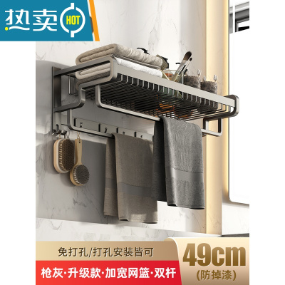 敬平枪灰色轻奢风毛巾架免打孔卫生间浴室浴巾架置物架太空铝架子厕所 枪灰升级款-加宽网篮49cm浴室置物架