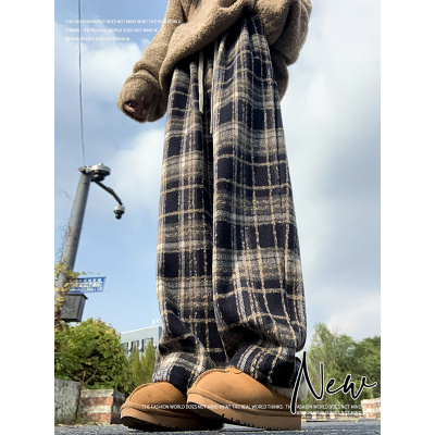 加厚格子裤女冬新款加绒裤子高腰垂感休闲毛呢休闲直筒阔腿裤