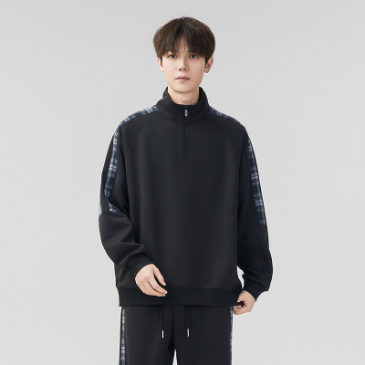休闲运动格子卫衣男士春秋季新款潮流立领套头半拉链上衣男女同款