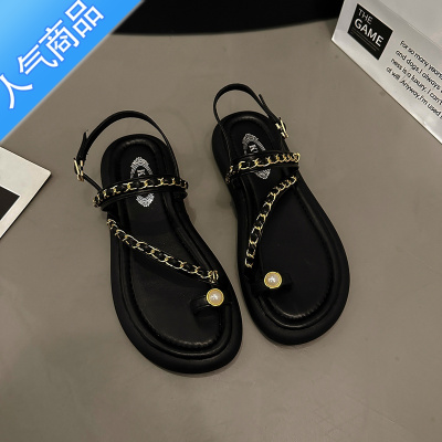 SUNTEK韩国凉鞋女夏季2023年新款小香风套趾链条简约软平底罗马沙滩鞋子