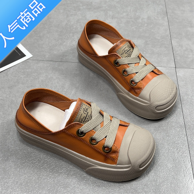 头层牛皮开口笑女鞋2024春季新款厚底大头运动休闲板鞋系带单鞋