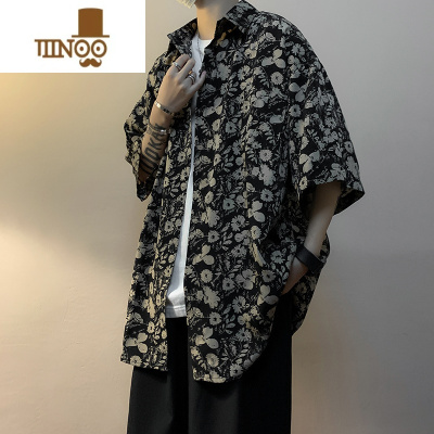 YANXU港风复古冰丝碎花衬衫男生短袖垂感痞帅潮牌宽松休闲古着衬衣外套