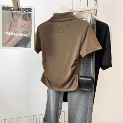 夏季新款半高领收腰短袖T恤女简约褶皱设计感修身短款上衣潮